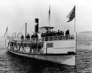 Once at Puget Sound, H.B. Kennedy put Athlon on the popular Seattle-Port Orchard (Navy Yard) Route, in competition with Joshua Green's boat, the Inland Flyer. Athlon's first captain on Puget Sound, in February 1901, was William Mitchell, who had worked his way up from cabin boy. (Mitchell eventually in 1933 became manager of the Kitsap Transportation Company, one of the last remaining competitors to the by-then dominant Puget Sound Navigation Company.)[2] By July 1901, H.B. Kennedy and Joshua Green reached a deal to end competition between their two boats, fixing rates on the route as was usual with these anti-competitive agreements. Over the years, the firms of H.B. Kennedy and Joshua Green's Puget Sound Navigation Company drew closer together and eventually merged. By 1903, Athlon was still owned by H.B. Kennedy personally, but was being operated by Puget Sound Navigation. This combination drove off all would be competitors including the Manette, and later, Arrow, even though Arrow was a much faster boat than Athlon, beating her by 30 minutes on a race from Seattle to Bremerton.[3]