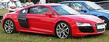 Audi AG unveiled the Audi R8 V10 on December 8, 2008.[16] It uses a FSI V10 engine,[13] based on the unit in the Lamborghini Gallardo LP560-4 (which in turn was based on the 5.2 FSI V10 as used in the C6 S6 and D3 S8), but is re-tuned to have a power output of 532 PS (391 kW; 525 hp), and 530 N⋅m (391 lbf⋅ft) of torque.[13][9] Compared to the V8 variant, the R8 V10's performance numbers are enhanced. Audi states the new 0 to 100 km/h (0 to 62 mph) acceleration time as 3.9 seconds,[13] 97 to 200 km/h (60 to 124 mph) in 8.1 seconds, and a top speed of 316 km/h (196 mph).[13] Other changes to the V10 version of the R8 include some aesthetic differences: such as all-LED headlights (a world-first), "V10" badging on the front fenders,[13] interior enhancements such as Bang & Olufsen 465 watt sound system,[13] a more aggressive body styling,[17] larger rear brakes, a dual outlet exhaust system and different wheels.[13]