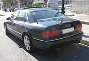 Audi S8 (D2) was produced from 1996 to 2003. The car featured a 4.2 liter V8 with 340 PS (250 kW; 335 hp). The D2 S8 could accelerate from 0-60 mph (97 km/h) in 6.2 seconds. It has a curb weight of 1,730 kg (3,814 lb). In 1999, the car was updated with a power increase to 369 PS (271 kW; 364 hp), which brought the 0-60 mph acceleration down to 5.6 seconds. Top speed was electronically limited to 155 mph (250 km/h). It has a curb weight of 1,845 kg (4,068 lb).[1] An Audi S8 (D2) was chosen as the car of the protagonists of the film Ronin.[2]