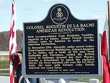 Augustin de La Balme received a letter of recommendation from Benjamin Franklin[3] and left for the United States to assist in the American Revolution. He arrived with a group of French volunteers that included the Marquis de Lafayette,[4] and expressed a "love of liberty" as the motivation for his service.[5] In 1777, he was appointed as the Colonial Army's Inspector General of Cavalry.[6] Due to his performance in the 1777 Battle of Brandywine, however, Casimir Pulaski was made a Major General over all cavalry, including La Balme, who was not at the battle.[7] When he learned that he would no longer be in command of the United States Cavalry, La Balme resigned in October 1777.[8]