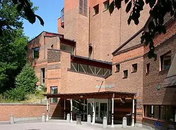 The building is built into the ground. From the north side and the main entrance it gives a low, modest impression, dominated by large glass surfaces. On the south side, the building is at its full height. Erskine breaks up the facade into many volumes of different size, structure and height in and interesting arrangement. The north facade is faced in brick in different shades of red brick, highly articulated with different surface textures. The roof, visible from a distance, features sun reflectors, typical of Erskine's style, which transmit daylight into the auditorium via skylights. The interior offers a vast panorama through the glass facade to the north which places the viewer in close contact with nature and the old oaks outside. Inside, the patterned brick walls return. The interior design has a natural feel through exposed bedrock in the lower foyer. The rustic lining of blonde woods is a characteristic feature throughout the building, presenting a warm contrast to the glass stone.[1]