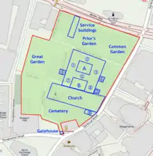 There were certainly a number of other monastic buildings within the friary precinct but little is known about them. There would, for instance, have been a number of service buildings to facilitate the friary's maintenance. The studium generale would have had its own building, and the building of a domus lectorum (house for the student lectors) was authorised in 1419. The friary is the only one in London known to have had its own prison.[24] It was at the centre of a scandal in 1525 when an imprisoned friar died there, leading to those responsible being imprisoned for a while in the Tower of London.[25] The friary also had extensive gardens, principally in the northern end of its precinct. The largest was the Great Garden, on the western side, which was some 388 ft (118 m) long by the 16th century. They would have been used to grow vegetables and medicinal herbs, and a 16th-century lease indicates that one of the gardens had fruit trees as well.[26]