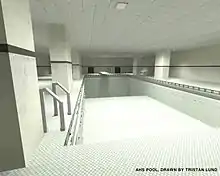 The school has three floors, each represented by a different color: first floor is red, second is green, and the third floor is blue. Most freshman classes are on the third floor, while the rest of the classes are organized by each education department (Language Arts, Social Studies, Mathematics and Science). The basement contains the cafeteria, a tunnel system for pedestrian traffic which was remodeled into storage, and a section that originally contained a four-lane pool. After the swimming teams moved to a new facility at Ellis Middle School in the early 1970s, the pool was only used for Phy Ed classes. The pool was closed and the section was remodeled into classroom and storage space after the Ellis fire of 1986.