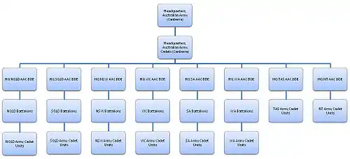 The Australian Army Cadets (AAC) is the youth military program and organisation of the Australian Army, tasked with supporting participants to contribute to society, fostering interest in Defence Force careers, and developing support for the Force.[1] The program has more than 19,000 Army Cadets between the ages of 12 and 20 based in more than 200 units around Australia.[2] The values of the AAC are "Service, Courage, Respect, Integrity and Excellence".[3]