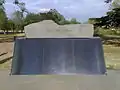 Approximately 130 metres (430 ft) long, the memorial features a long pathway of light-grey basalt pavers cut to resemble railway sleepers, reminiscent of those used on the Thai–Burma Railway.[2] To the southern side are two canted black polished granite walls with the names of all known Australian prisoners of war. They are listed alphabetically by war and no rank is acknowledged. The two walls are separated in the middle by a square pool of water that features six large basalt obelisks. These feature the names of the countries where Australian POWs were held. The obelisks centralised in the pool of water symbolise the Australian POWs being cut off and isolated from their homeland by the ocean.[2] The sixth obelisk is deliberately toppled on its side and broken, symbolising "The Fallen".