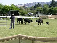 A Working Kelpie can be a cheap and efficient worker that can save farmers and graziers the cost of several hands when mustering livestock.[24] The good working Kelpies are herding dogs that will prevent stock from moving away from the stockman.[9] This natural instinct is crucial when mustering stock in isolated gorge country, where a good dog will silently move ahead of the stockman and block up the stock (usually cattle) until the rider appears. The preferred dogs for cattle work are Kelpies, often of a special line, or a Kelpie cross.[25] They will drive a mob of livestock long distances in extremes of climates and conditions. Kelpies have natural instincts for managing livestock. They will work sheep, cattle, goats, pigs, poultry, and other domestic livestock. The Kelpie's signature move is to jump on the backs of sheep and walk across the tops of the sheep to reach the other side and break up the jam. A good working Kelpie is a versatile dog – they can work all day on the farm, ranch, or station, and trial on the weekends. Kelpies compete and are exhibited in livestock working trials, ranging from yards or arenas to large open fields working sheep, goats, cattle, or ducks.[13]
