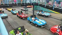 The first fleet of Autopia cars were dubbed "Mark I". Throughout Disneyland's first few years, Autopia went through a few fleets, as the cars took much abuse. Though basically the same look, they went through Mark I, II, III, and IV by 1958. When the Monorail, Submarine Voyage, and Matterhorn debuted in 1959, so did a new fleet with an all-new look – the "Mark Vs". The next design, Mark VI, came in 1964. It was at this time (1965) the center guide rail was first installed.[1] 1967 brought another new design, the Mark VIIs, which cost $5,000 for each car and looked similar to the new Corvette Stingray.[1] They would remain in service through 1999, till a breed of Mark VIIIs would hit the Autopia roadway. The cars were manufactured by Intermountain Design, Utah [2]