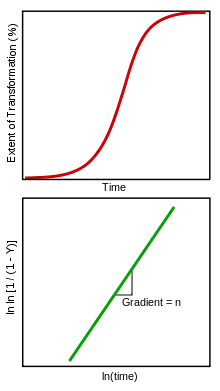 which allows the determination of the constants n and k from a plot of ln ln(1/(1 − Y)) vs ln t. If the transformation follows the Avrami equation, this yields a straight line with slope n and intercept ln K.
