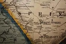 The main building was 350 feet long and 70 feet wide.[4] Production in 1855 was carried out by a workforce of fifty men. Wages were only $2.50 to $3 per day, but this was greater than the $1 wage received by local iron furnace workers.[5] An axe-finishing shop at Thomas Mill in Bellefonte was established in 1832 through partnership with Franklin Smith, but this venture failed after only a year. Its failure caused a split between the brothers, with Harvey assuming the debts.[6] Later, a finishing plant was added near Paradise (now Fisherman’s Paradise; lower left on map above).[7]