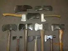 Around 1900, all-steel heads came into use. An online video from 1964 captures the effort required to make axes, including steeling the head and hanging ("hafting") a handle or haft.[2] Initially, output was limited to felling (“chopping”) axes and soon grew to over 300 axe heads per day.[3]