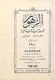 The monthly journal az-Zuhūr (Arabic: الزهور; DMG: az-Zuhūr; English: "Flowers") was published in Cairo[1] from 1910 until 1913. Altogether, 40 issues exist. The editor Anṭūn al-Ǧumayyil (1887-1948) did already participate in the publication of the Beirutian newspaper al-Bašīr (1870-1947) and the Egyptian newspaper al-Ahrām (1875-today).[2]