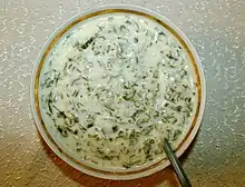 | Ovdukh | A cold soup based on a matsoni–water mixture poured over sliced cucumbers, chopped boiled meat, quarters of hard-boiled egg, and greens (dill, coriander, basil, tarragon, and sometimes mint).[6] |