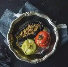 | Badımcan Dolması | Tomato, sweet pepper, and aubergine stuffed with minced lamb or beef mixed with chickpeas. |