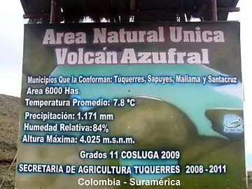 Azufral is a stratovolcano located in the department of Nariño in southern Colombia, 12 km (7 mi) west of the town of Túquerres. It is the only volcano of the Western Ranges of the Colombian Andes. Its name derives from the Spanish word for sulfur, azufre. The volcano is considered semi-dormant but there are numerous fumaroles in the summit crater. The summit of the volcano has an altitude of 4,070 metres (13,350 ft),[1] and the north-western side of the crater contains a crescent-shaped lake named Laguna Verde (English: Green Lake) at 3,970 m (13,025 ft). The lake is 1,100 m (0.68 mi) long and 600 metres (2,000 ft) wide.[2] and its bright green color is a result of the sulfur and iron-based deposits in the crater. There are also two other much smaller lakes in the crater, Laguna Negra (English: Black Lake) and Laguna Cristal (English: Crystal Lake).