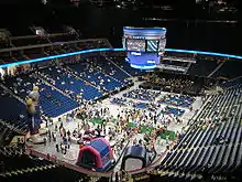 The arena encompasses 565,000 square feet (52,500 m2) and reaches a maximum height of 134 feet (41 m). Inside, the bowl area's ceiling rises 120 feet (37 m) over the base floor and a 930-foot (280 m)-long HD ribbon screen wraps around the three-level seating area. There are 17,343 fixed seats, each ranging from 20 inches (51 cm) to 22 inches (56 cm) wide—an average width greater than the industry standard, including that of Chesapeake Energy Arena in Oklahoma City.[1] Actual capacity fluctuates with configuration patterns, and total seating can vary from 13,644 to 19,199—13,644 for partial-use concerts, 16,582 for arena football, 17,096 for hockey, 17,839 for basketball, and 19,199 for center stage concerts.[2] The bowl area's second floor, an exclusive carpeted level with a complete bar, houses press areas and 37 luxury suites, each with 15 22-inch (56 cm) seats and furnished gathering and kitchen areas. In the main concourse, more than 130,000 square feet (12,000 m2) of terrazzo flooring has aggregate that contains 70% mother of pearl.[1] Private funding exceeded original forecasts, and unexpected increases in revenue from corporate sponsorships, donations, and purchases of box seats and luxury boxes paid for an advanced light display for the glass wall that wraps around the front of the building and the scoreboard.[18]