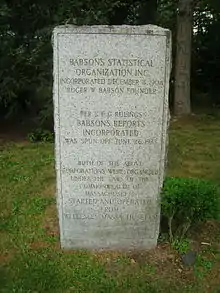 Babson-United, Inc. is the institutional successor to the securities analysis and investment management business founded in Boston in 1904 by Roger Babson.[1] Originally organized as The Office of Roger Babson, it was subsequently named Babson's Statistical Organization, Business Statistics Organization, and Babson's Reports.[2] Since 2004, it has operated as a private, family-owned, non-bank holding company,[1] and no longer provides investment news or advice to outside clients.