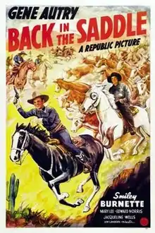 Back in the Saddle is a 1941 American Western film directed by Lew Landers and starring Gene Autry, Smiley Burnette, and Mary Lee.[2] Written by Richard Murphy and Jesse Lasky Jr., the film is about a singing cowboy who attempts to bring peace between ranchers and the operator of a copper mine whose chemicals are poisoning the area's water supply.[1] The film features several of Autry's hit songs, including "Back in the Saddle", "I'm An Old Cowhand", and "You Are My Sunshine".[1]