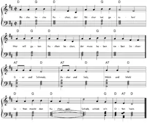 Backe, backe Kuchen is a popular German language children's rhyme. The original was in Saxony and Thuringia with several textual versions from 1840.