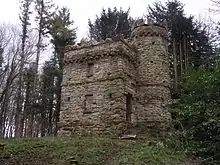 Set on a motte at the end of a main drive from Badminton House is the folly known as Ragged Castle, built c1750 by Thomas Wright of Durham and now a building at risk.[11] It is a Grade II* Listed Building.[12]