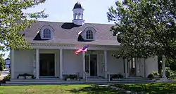 Library Hall is located roughly in the center of Bailey Island, on the east side of Harpswell Island Road (Maine State Route 24). It is a 1 1⁄2-story wood-frame structure, with a side-gable roof, clapboard siding, and a fieldstone foundation. A shed-roofed porch extends across the west side, supported by square posts with small capitals. The main facade has three pairs of French doors, evenly spaced, providing access to the hall, and there are three round-topped dormers in the main roof, which is capped by a small cupola with belfry. The east side of the building has a shed-roof ell extending across much of its width. Palladian windows are set on the building's north and south sides. The interior of the main block is a large hall, with the kitchen located in the rear ell. One end of the hall has a stage set under a proscenium arch.[2]