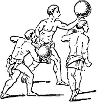 Balloon, baloun, balloon-ball or wind-ball was a game similar to the modern game of volleyball in which a leather ball would be batted by the fist or forearm to prevent it from touching the ground. The game was played in ancient Rome where it was known as follis— the Latin word for a leather bag. Such a ball made of leather was quite heavy and so protection might be used such as a leather gauntlet or wooden bracer.[1]