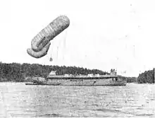 In 1849 the Austrian Navy ship SMS Vulcano took part in the first aggressive use of balloons in warfare,[1][2] serving as a balloon carrier (the precursor to the aircraft carrier)[3] in the first offensive use of air power in naval aviation.[4][5][6] Austrian forces besieging Venice attempted to float some 200 paper hot air balloons, each carrying a 24- to 30-pound bomb that was to be dropped from the balloon with a time fuse over the besieged city. The balloons were launched mainly from land; however, some were also launched from Vulcano. The Austrians used smaller pilot balloons to determine the correct fuse settings. At least one bomb fell in the city; however, due to the wind changing after launch, most of the balloons missed their target, and some drifted back over Austrian lines and the launching ship Vulcano.[7][8][9]