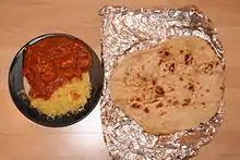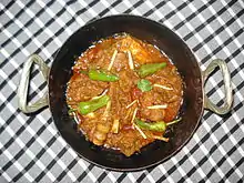A balti or bāltī gosht (Urdu: بالٹی گوشت, Hindi: बाल्टी गोश्त) is a type of lamb meat or goat meat curry served in a thin, pressed-steel wok called a "balti bowl".[1] The name may have come from the metal dish in which the curry is cooked,[2][3] rather than from any specific ingredient or cooking technique.[4] Balti curries are cooked quickly using vegetable oil rather than ghee, over high heat in the manner of a stir-fry, and any meat is used off the bone. This combination differs sharply from a traditional one-pot Indian curry which is simmered slowly all day. Balti sauce is based on garlic and onions, with turmeric and garam masala, among other spices.[3]
