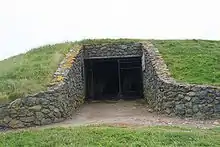 Barclodiad y Gawres (Welsh for "the giantess's apronful") is a Neolithic burial chamber between Rhosneigr and Aberffraw on the south-western coast of the island of Anglesey in North Wales. It is an example of a cruciform passage grave, a notable feature being its decorated stones. Similar graves and marks exist across the Irish Sea in the Boyne Valley.[1]
