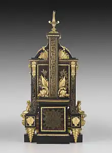 Barometer Clock (Boulle) by André-Charles Boulle is a late seventeenth-century French clock created out of ebony, turtle shell, brass, gilt bronze, and enamel. The clock case is decorated on all sides and was intended as either a centerpiece or for display on a mantel in front of a mirror.[1] The centerpiece of the clock is a relief of "Father Time Carrying Off Truth." [2]