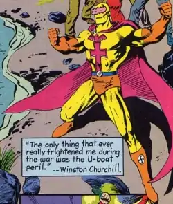 He is a frequent opponent of the heroic All-Star Squadron, a band of costumed adventurers who fight domestic and foreign menaces during World War II.[3] Baron Blitzkrieg was originally an especially vicious German army officer who was blinded and disfigured when a concentration camp prisoner threw a bottle in his face. German scientists restored his sight but not his appearance. So they experimented on Blitzkrieg, giving him superhuman strength, invulnerability, optical energy beams and the ability to fly. However, each of these abilities are manifested one at a time and only with training is he able to incorporate them together.[4]