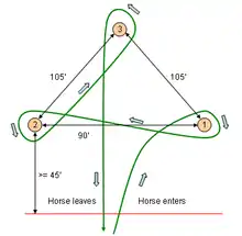 Standard barrel racing patterns require measured distances between the start line and the first barrel, from the first to the second barrel, and from the second to the third barrel. [6]