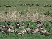 As with the other refuges within the Willamette Valley National Wildlife Complex, the primary management goal of Baskett Slough National Wildlife Refuge is to provide high quality wintering habitat for geese, especially the dusky Canada goose (Branta canadensis subsp. occidentalis), so as to ensure healthy, viable goose populations while minimizing goose browse damage to crops on private agricultural lands. Unlike most other Canada geese, dusky Canada geese have limited summer and winter ranges. They nest on Alaska's Copper River Delta and winter almost exclusively in the Willamette Valley. Habitat loss, predation, and hunting caused a decrease in their population. Dusky Canada geese usually appear at the Refuge in the fall and use it as their last stop before starting the spring journey back to their Alaska nesting grounds. During the winter of 2001, a survey found a total of 35,988 geese, swans and ducks in the refuge.