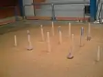 The big pins are arranged in groups of three (one behind each other) in three lines at the far end of the track. A player has to hit the small pin (worth five points) first for it to be a valid throw, the other pins are worth one point each. Unlike in other variants, pins knocked over by a ball rebounding from the side panels also count.
