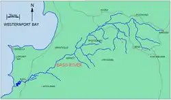 The Bass River rises below the locale of Woodleigh, west of the South Gippsland Highway, with its headwaters drawn from the Strzelecki Ranges, north of the town of Korumburra. The river flows generally south by west, joined by one minor tributary, before reaching its river mouth and emptying into the Western Port, west of the town of Bass within the Bass Coast Shire. The river descends 60 metres (200 ft) over its combined 59 kilometres (37 mi) course.[3]