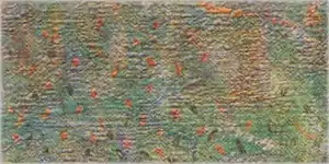 The spot depicted is just short of four miles from the centre of Paris. In fact, the figures on the river-bank are not in the commune of Asnières, but in Courbevoie, the commune bordering Asnières to the west. The bathers are in the River Seine. The slope forming most of the left hand side of the painting was known as the Côte des Ajoux, near the end of the rue des Ajoux, on the north bank of the river. Opposite is the island of la Grande Jatte, the east tip of which is shown as the slope and the trees to the right, and which Seurat has pictorially extended beyond its actual length. The Asnières railway bridge and the industrial buildings of Clichy are in the background. Locations such as this one were sometimes shown on French nineteenth century maps as Baignade (or, ‘bathing area’).[2][3]
