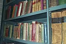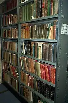 The Old Bathurst School of Arts Library Collection was probably begun soon after the establishment of the Bathurst School of Arts in 1855. In the financial year 1913-1914, the School of Arts Library Collection was measured at nearly 20,000 volumes.[5] In the 1940s at least the collection was still housed on the first floor of the 1862 School of Arts building on the corner of William and Howick Streets.[6] Bathurst City Council acquired the collection in 1956 when it took over the Old School of Arts building. The estimated 2000 books now held in this collection were probably separated out from the Bathurst City Library's general holdings soon after acquisition, and have stored together away from public access. They have never been available for lending, although they has been viewed by members of the public from time to time under supervision.[7][1]
