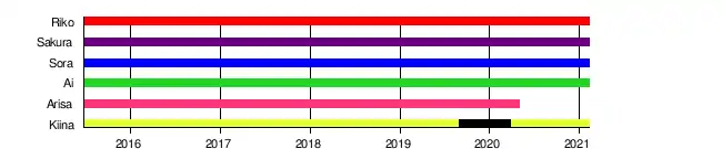 | Arisa Nishigaki (西垣 有彩) | Pink | July 21, 2002 | Departing the group on April 29th, 2020 to continue School.[4] |