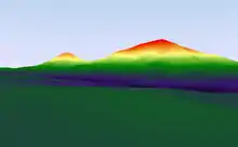 A unique geological feature of Battle Mountain is that the western slope outcrops are composed entirely of alkalai feldspar granite, while the eastern slope up to and including the summit is entirely rhyolitic. This provides strong evidence of a theorized lateral explosive eruption event centered on the eastern slope at approximately 704 Ma as proposed by Woolman (2016). Further mathematical geology evidence which supports this theory includes a paleaogeographic reconstruction of the mountain by Woolman utilizing artificial neural networks and Markov chain geostatistical models including period climate condition-based soil erosion rates, Kirkby's hillslope movement evolution equations and recursive biogeochemical soil erosion rates in felsic granitic conditions. The result was the digital reconstruction image shown on the left, indicating what Battle Mountain may have looked like 704 million years ago on the western slope.