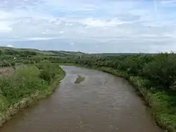 The Battle River flows for 570 kilometres (350 mi) and has a total drainage area of 30,300 square kilometres (11,700 sq mi). The mean discharge is 10 m³/s at its mouth.[3]