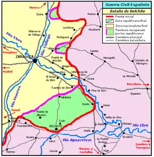 ![]() Progress of the Battle of Belchite with initial and final situations shown. | |||||||