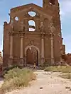The whole town was destroyed. Franco ordered that the ruins be left untouched as a "living" monument of war. A new town was constructed near the former. The holes and caves in Lobo Hill south of Belchite from where the Spanish Republican artillery positions fired towards what is now Belchite Old Town have been preserved and are open to visitors.[1]