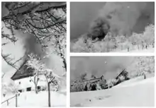 After the battle at Dražgoše, German troops killed 41 villagers, including 21 civilians at Jelenšče,[13] executing 18 (among them 7 children below 18 years, including two 11-year-olds, and a 13-year-old). They killed two more trying to escape, and also killed a 3-year-old girl, when a German soldier threw a grenade into a cellar full of civilians. During the evening of the following day, a further 18 male residents who had previously escaped, only to be apprehended as they returned, were executed, houses were looted, and the village was set on fire. In February of 1942, the Germans returned to demolish the entire village with explosives, forbidding entry into the village until the end of the war.[7] The remaining villagers were then rounded up and sent to concentration camps.[14][15]