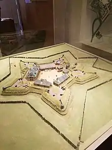 Fort Cumberland was located on the Isthmus of Chignecto, which connects modern mainland Nova Scotia with New Brunswick. The area was strategically important in earlier conflicts between the French colony of Acadia and British-controlled Nova Scotia. Originally built by the French in 1750 as Fort Beauséjour, Fort Cumberland was in deplorable condition. Won from the French in the Battle of Fort Beauséjour in 1755, the fortifications had been minimally garrisoned by the British after the Seven Years' War and abandoned in 1768.[9] As early as June 1775, Colonel Joseph Goreham had been ordered by General Thomas Gage to raise the Royal Fencible American Regiment of Foot[10] and natives in Nova Scotia for the defense of the province against Patriot activity.[11] Arriving at the fort in the summer of 1776, Colonel Goreham and a garrison of 200 Loyalist[4] troops of the RFA did what they could to restore the premises to a defensible condition.[12] But Goreham had not been adequately provisioned and his men lacked everything from victuals to uniforms.[13] Furthermore, the locals were generally sympathetic to the Patriot cause, and refused to assist in rehabilitating the fort, even trying to induce members of the garrison to defect.[13][14]