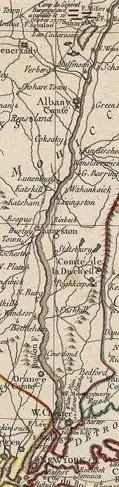 The Hudson River valley was a strategically critical area throughout the American Revolutionary War. Through this area moved supplies, men and materials between the New England states and those further south, something that became even more vitally important when the British largely abandoned New England as an objective of military control later in the war. In June 1777, General John Burgoyne began an attempt to gain control of this key area by moving south from the British province of Quebec. After his early success at Ticonderoga, his campaign become bogged down in logistical difficulties, not reaching Saratoga, New York until mid-September.[5] Burgoyne held expectations that his campaign would be supported by military forces based in New York City under the command of General William Howe, and that the forces would meet at Albany, about 40 miles (64 km) south of Saratoga.[6]