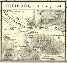 The Battle of Freiburg, also called the Three Day Battle, took place on 3, 5 and 9 August 1644 as part of the Thirty Years' War.[1] It took place between the French, consisting of a 20,000 men army, under the command of Louis II de Bourbon: the Prince of Condé (the Duke of Enghien: Duc d'Enghien) and Henri de La Tour d'Auvergne: Viscount de Turenne, and a Bavarian-Imperial army of 16,000 men under Field Marshal Franz von Mercy.[2] On 3 and 5 August, the French suffered heavy casualties despite having greater numbers.[3] On the 9th, Turenne's army flanked the Bavarians by heading to Glottertal through Betzenhausen and cutting off their supplies, where they faced off against each other, with the latter suffering heavy casualties.[3] The battle resulted in both parties losing approximately 7,500 men, and the outcome was inconclusive, as the Bavarians retreated due to lack of supplies and the sheer greater numbers of the French.[4] Following this battle, the French took advantage of the retreating Bavarians by conquering a large part of the Upper Rhine region.[5] Consequently, in 1645, Battle of Nördlingen was fought between the same parties which resulted in the victory for the French.[5]