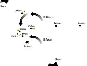 Meanwhile, infantry of 3rd Panzer Division attacked from Walhain-St.Paul against Perbais at 09:15, but they too stuck fast by 11:00. The war diarist of XVI Corps complained that the tanks of 4th Panzer had joined the fray before the anti-tank obstacle had been cleared. The corps operations officer of French descent, Chales de Beaulieu, criticised the 3rd Panzer Division for allowing its infantry to bog down while leaving its tanks in reserve.[32]