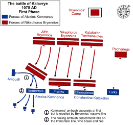 Having restored his surviving forces to order, and aware of the confusion in Bryennios's forces, Alexios decided to counter-attack. The plan he laid out made far greater use of the particular skills of his Turkish horse-archers. He divided his force into three commands, of which two were left behind in ambush. The other, formed from the Immortals and the Chomatenoi under Alexios's own command, was not arrayed in one continuous line, but broken up in small groups, intermingled with other groups of Turkish horse-archers. This command would advance on the rebels, attack them, then feign retreat and draw them into the ambush.[19]