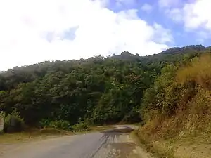 Kohima Ridge itself runs roughly north and south.[35] The road from Dimapur to Imphal climbs to its northern end and runs along its eastern face. In 1944, Kohima was the administrative centre of Nagaland. The Deputy Commissioner was Charles Pawsey. His bungalow stood on the hillside at a bend in the road, with its gardens and tennis court, and a clubhouse, on terraces above.[1] Although some terraces around the village were cleared for cultivation, the steep slopes of the ridge were densely forested.[1]
