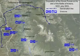 However, on the evening of July 28, under heavy pressure, the Bulgarian army was forced to abandon the town, while it set fire to a quarter of it during the retreat.[9][10] On the following day, the counterattacking Bulgarians attempted to encircle the outnumbered Greeks in a Cannae-type battle by applying pressure on their flanks.[11] Nevertheless, the Greeks launched counter-attacks at Mehomia and to the west of Kresna and by July 30 the Bulgarian attacks had subsided somewhat. On the eastern flank, the Greek army launched an counterattack towards Mehomia through the Predela pass. The offensive was stopped by the Bulgarian army on the eastern side of the pass and fighting ground to a stalemate. On the western flank, an offensive was launched against Charevo Selo with the objection of reaching the Serbian lines. This failed and the Bulgarian army continued advancing, especially in the south, where by 29 July the Bulgarian forces had cut the Greek line of retreat through Berovo and Strumitsa, leaving the Greek army with only one route of retreat.[12][13][14] However, after a three days fighting at the sectors of Pehchevo and Mahomia, the Greek forces retained their positions.[15] On July 30, the Greek headquarters planned to launch a new attack in order to advance towards the sector of Gorna Dzhumaya.[16] On that day hostilities continued with the Bulgarian forces deployed on strategic positions north and northeast of the town.[17]