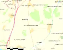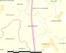 The Germans had built new defensive lines during the battle and the first two were called the Riegel I Stellung/Allainesstellung (Switch Trench I Position/Allaines Line), a double line of trenches and barbed-wire several miles further back, as a new second line of defence along the ridge north of the Ancre valley, from Essarts to Bucquoy, west of Achiet le Petit, Loupart Wood, south of Grévillers, west of Bapaume to Le Transloy and Sailly-Saillisel. On the reverse slope of that ridge, the Riegel II Stellung/Arminstellung (Switch Trench II Position/Armin Line) ran from Ablainzevelle to west of Logeast Wood, west of Achiet le Grand, the western outskirts of Bapaume, to Rocquigny, Le Mesnil en Arrousaise to Vaux Wood. Riegel III Stellung branched from Riegel II Stellung at Achiet le Grand and ran clockwise around Bapaume, then south to Beugny, Ytres, Nurlu and Templeux la Fosse.[16] The first two German reserve lines had various British titles (Loupart/Bapaume/le Transloy/Bihucourt lines) and the third line was known as the Beugny–Ytres Switch.[17]